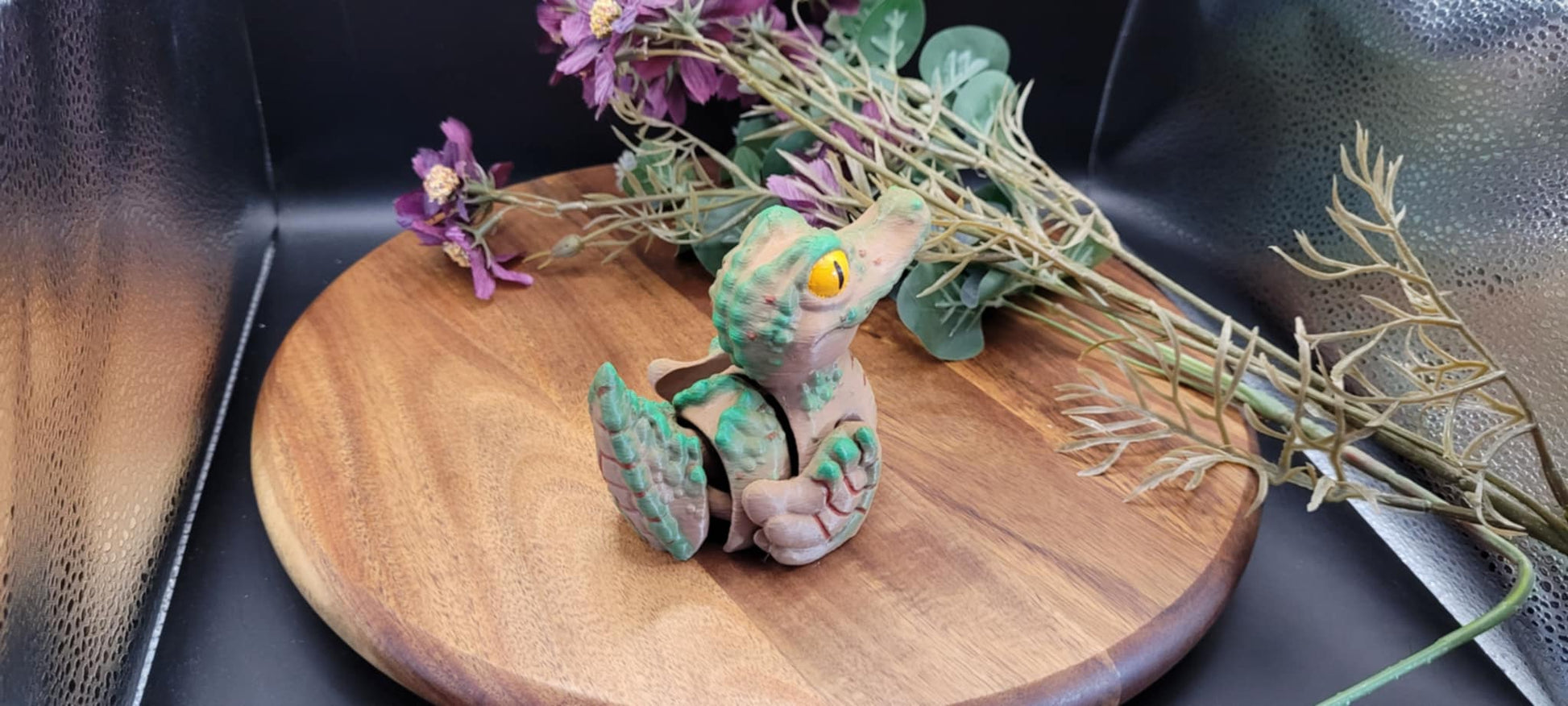 *The quakodile pictured is made with light brown PLA. It has their face details hand painted with dry brushing techniques and fully sealed with a weatherproof sealant.